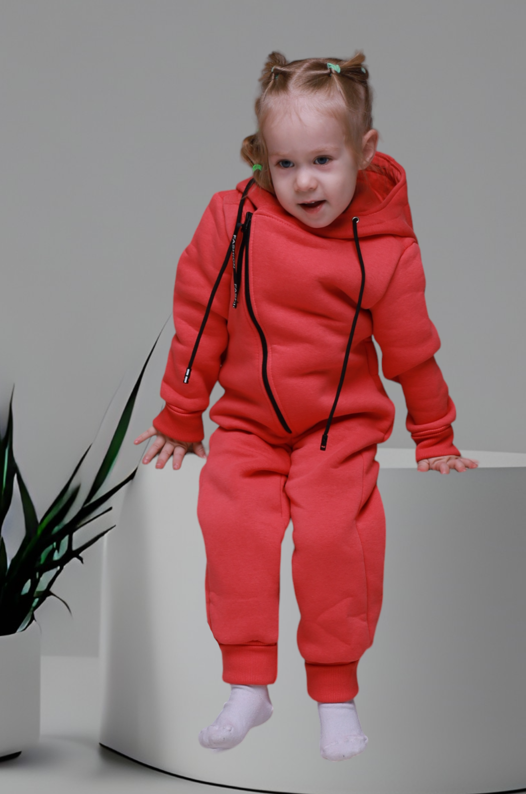 Комбинезон с капюшоном на подкладке, с открытыми ножками, рукавчики на манжете, спереди на косой молнии.
