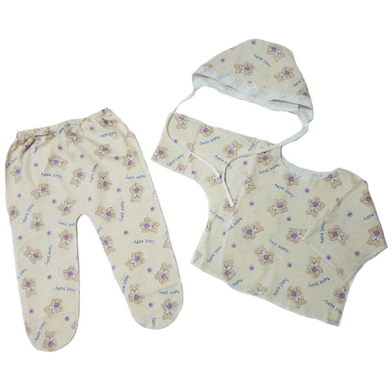 Комплект состоит из распашонки с рукавчиками трансформерами и с кнопочкой на одной стороне, ползунков на резинке, чепчика. Все швы у набора выполнены наружу. Рисунки в каждой партии отличаются.