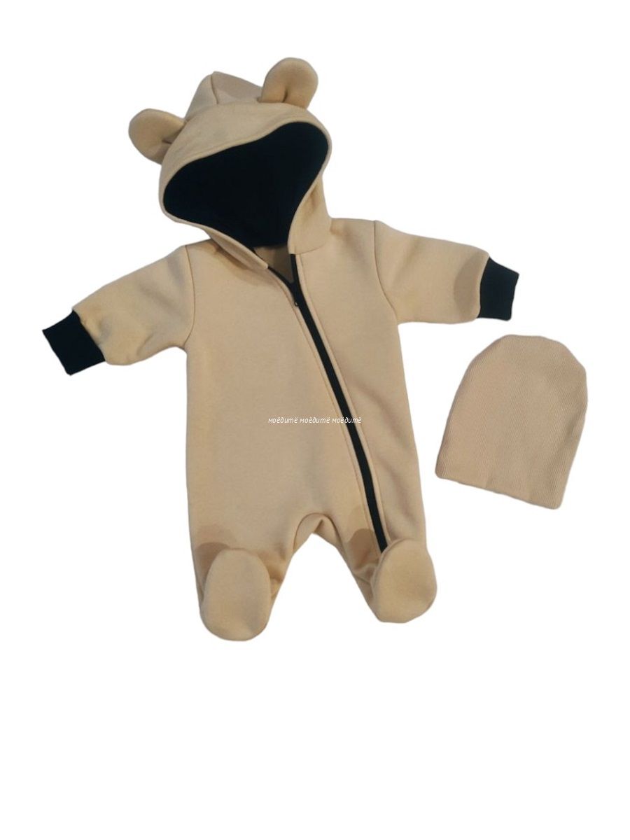 "МоёДитё" комбинезон выполнен из футера с начёсом. Комбинезон с капюшоном на подкладке и декорирован сверху ушками, с закрытыми ножками, рукава на манжетах, спереди косая молния до конца одной ножки. Шапочка из кашкорсе можно одевать как с отворотом, так и без. Очень хорошо тянется.