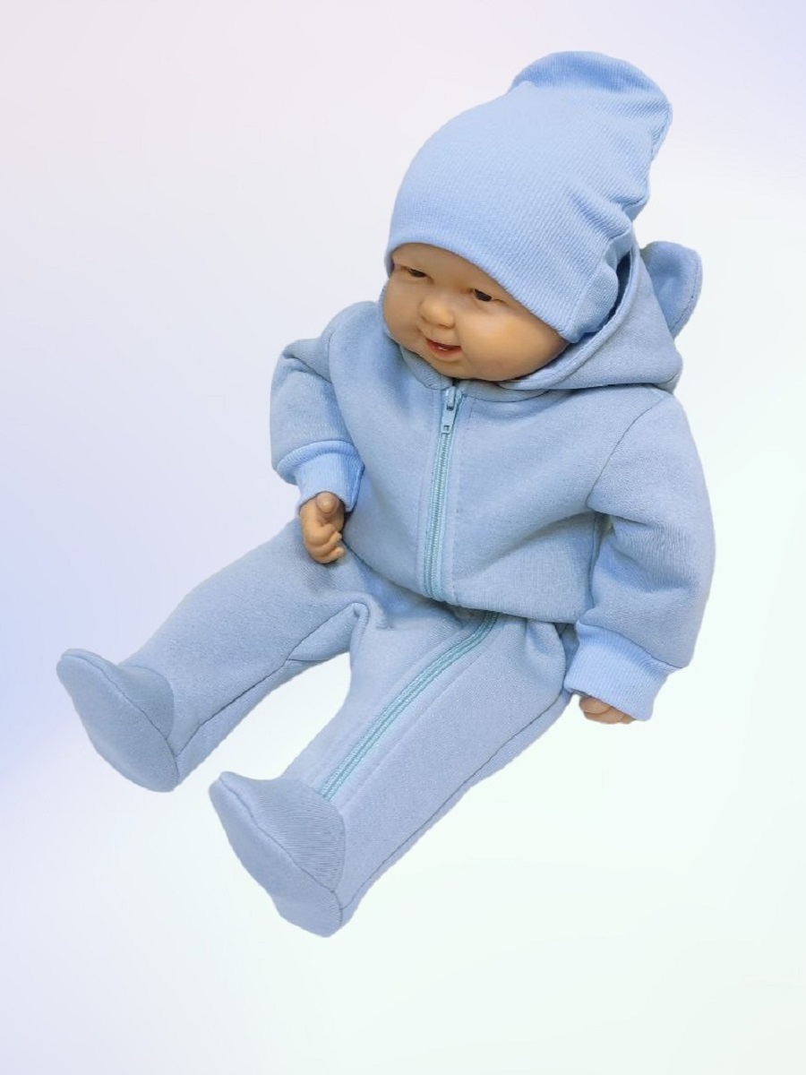 Комбинезон выполнен из футера двухнитки с начёсом. Спереди косая молния, капюшон на подкладке. У комбинезона закрытые ножки, на рукавах манжеты.